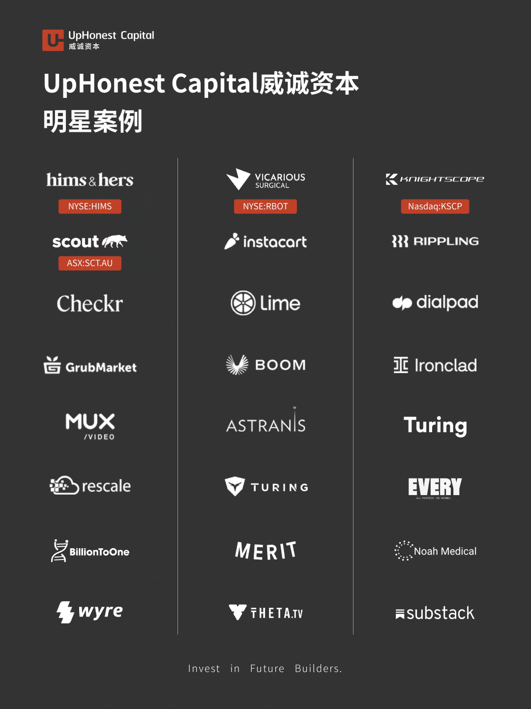 成立于2015年,由硅谷知名投资人郭威创立 ,以全球化视角 ,专注投资硅谷和中国的早期优质初创企业。成立至今,机构累计投资超过350家初创企业,20个独角兽项目。UpHonest Capital立足跨境创新,通过运营旗下拥有10w+影响力的科技自媒体、国际化孵化加速平台、覆盖硅谷科技人才的智库与活跃的创业者社群等多元业态,深耕早期孵化投资,构建了独特且完善的早期跨境投资生态,赋能未来创变者。