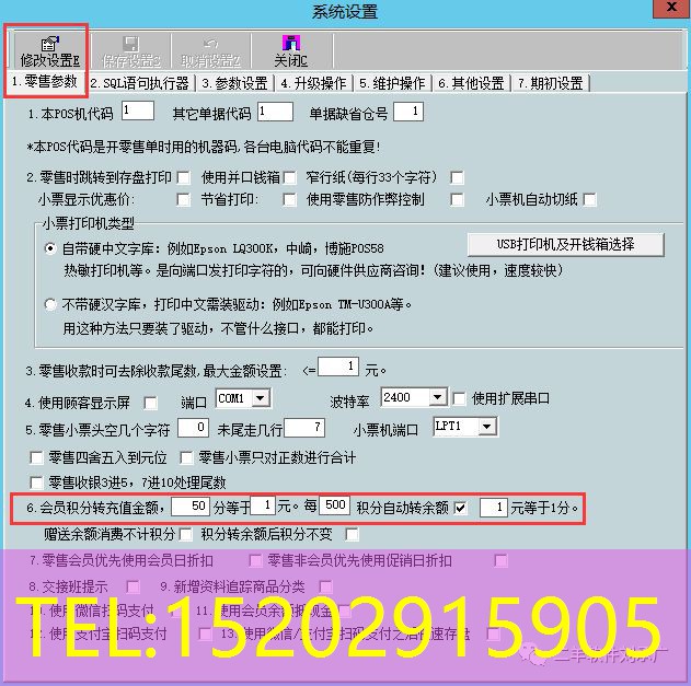 在会员积分转余额之前,有些顾客的会员积分已经达到了您设定的标准,但系统不会自动进行后台转换,必须要在顾客下次消费时才会转换,请先到:系统–系统设置–修改设置–零售参数–6.会员积分转充值余额,如下图▼