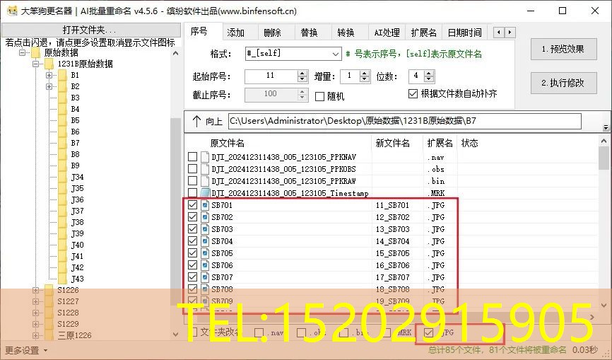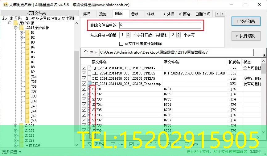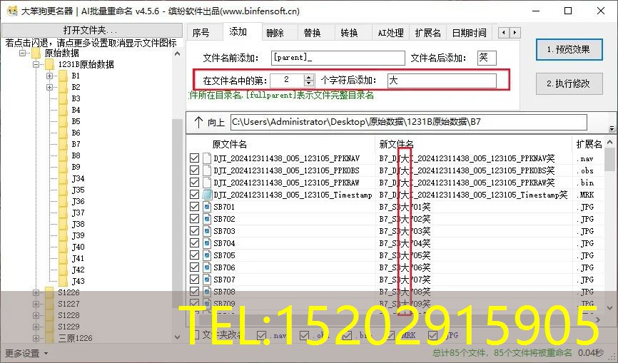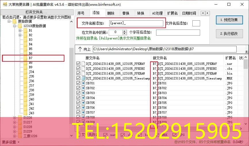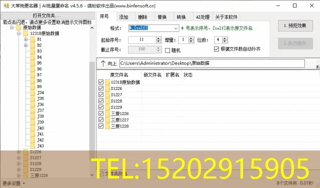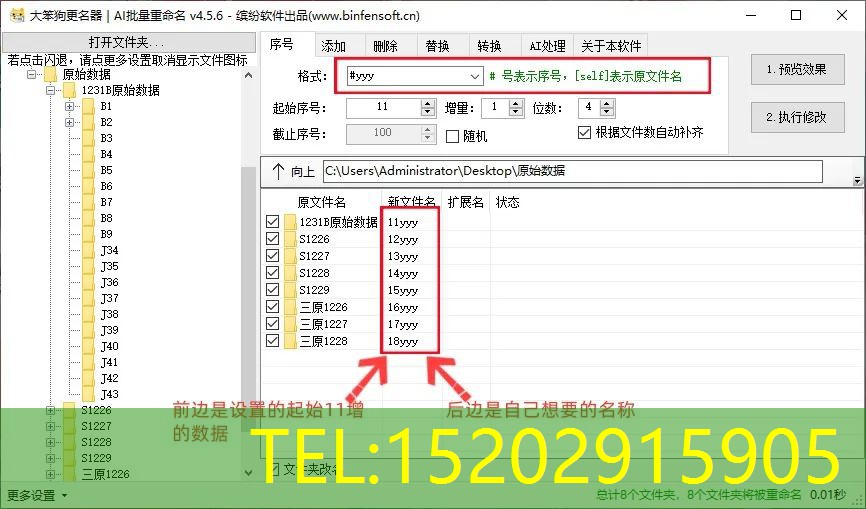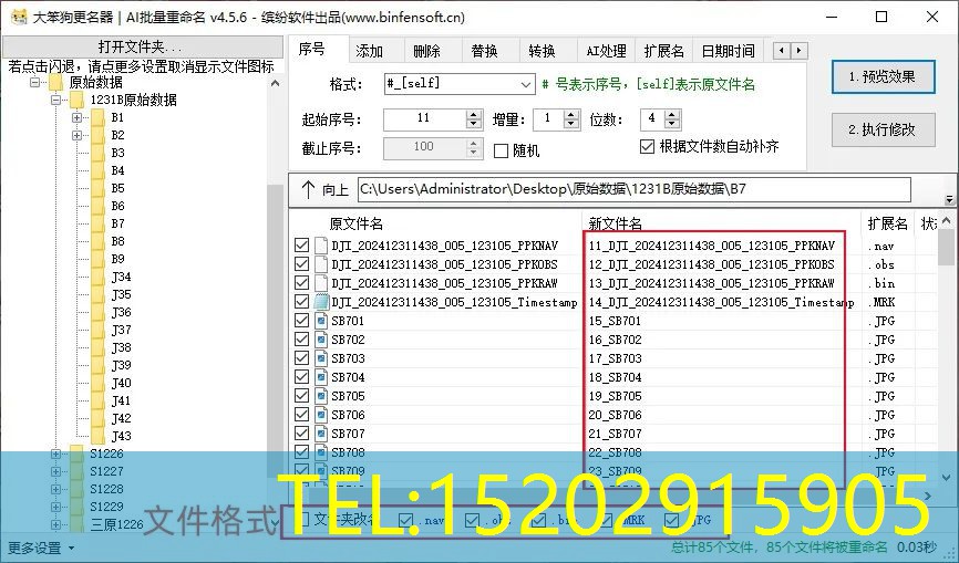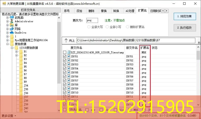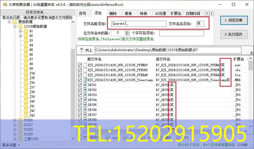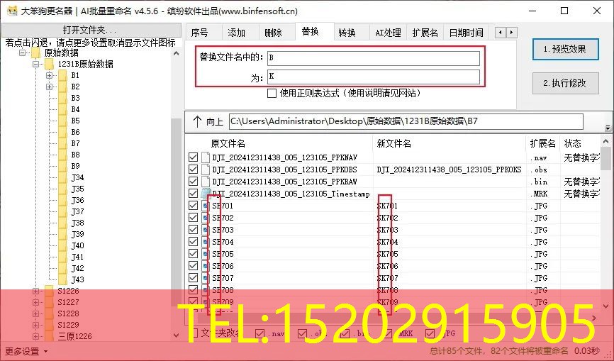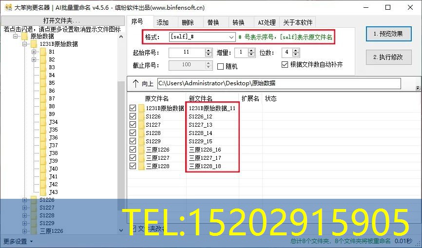 输入完想要的条件之后,点击“1预览效果”,可以查看有没有遗漏错误,确认无误后点击“2执行修改”即可完成重命名操作。
