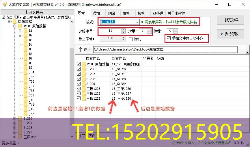 重命名文件:按原格式#_[self],这里“#”代表下边的序号,而“[self]”表示原始文件名称。起始序号选的“11”即代表“#”的初始数值。勾选“根据文件自动补齐”是为了保证数据冗杂的情况下,不出现遗漏。